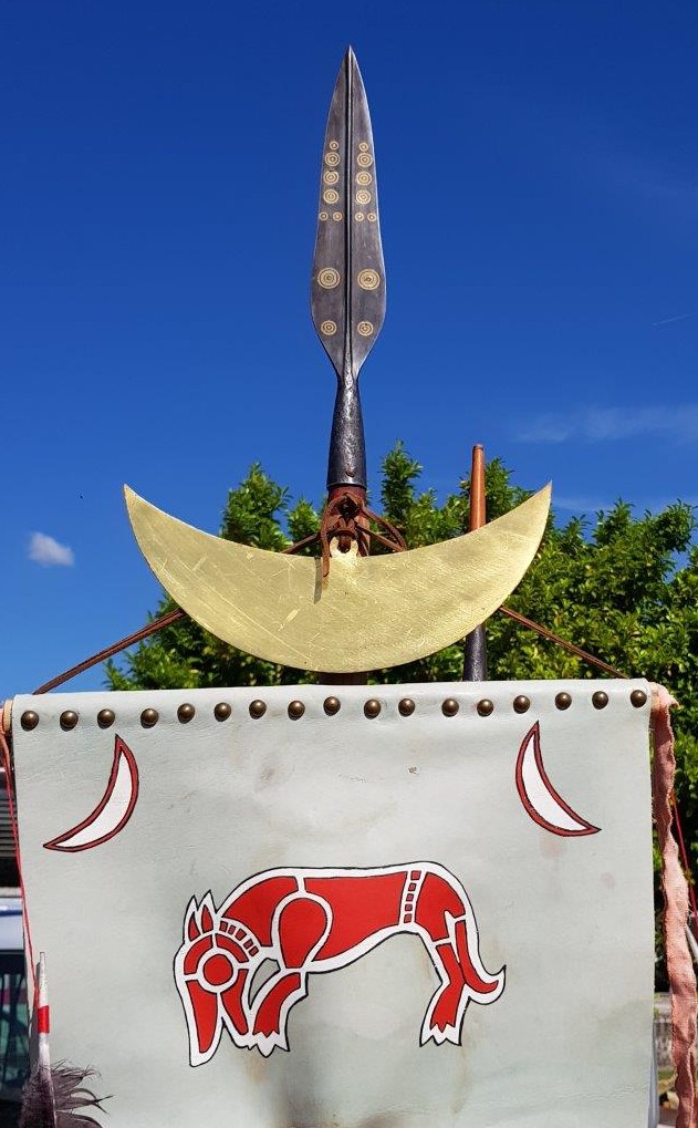 Lance forgée en vieux fer à inclusions circulaires en laiton.