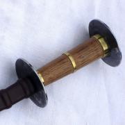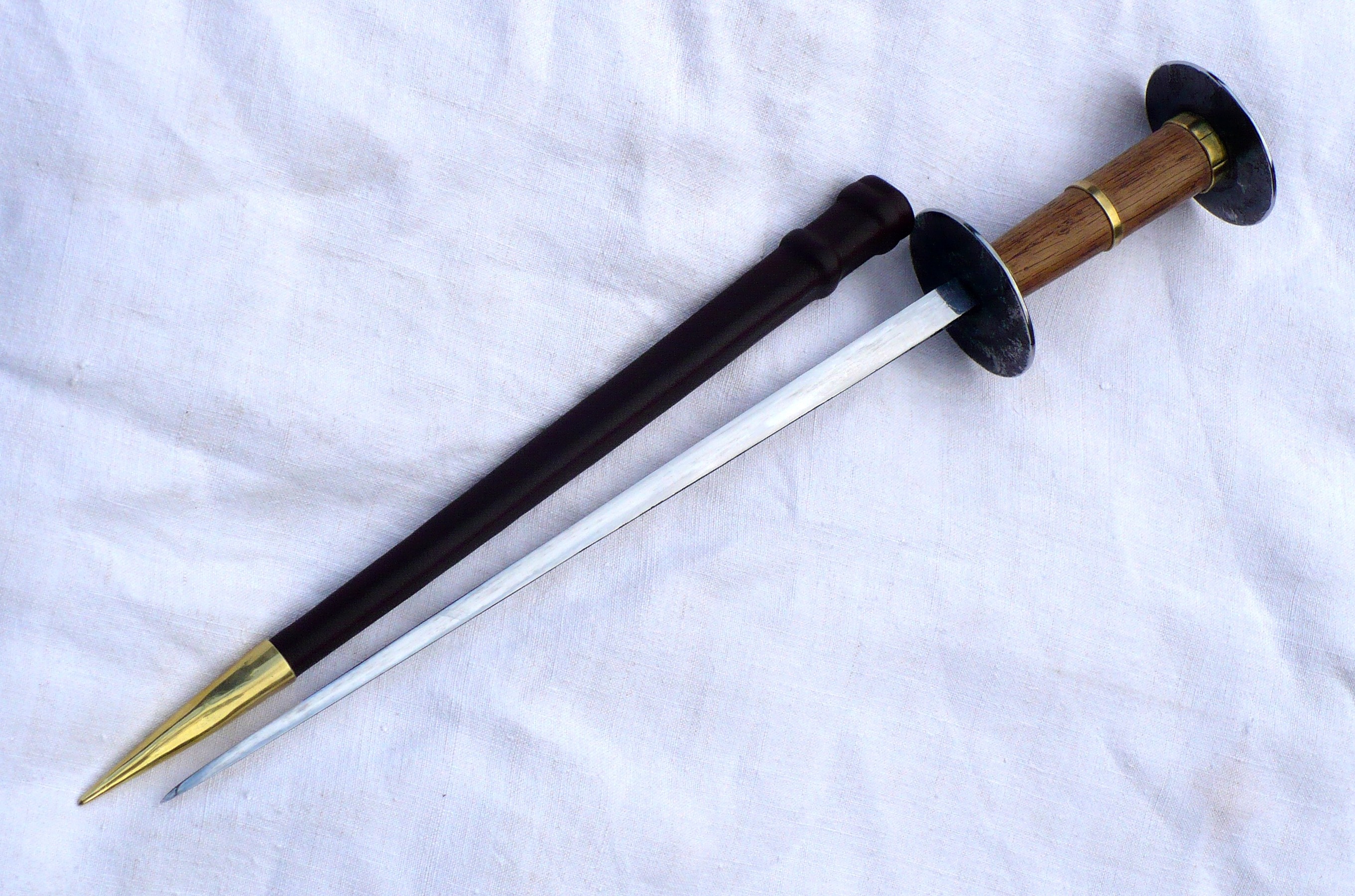 Type d'objet Armes Époque Bas moyen age Prix indicatif (de janvier 2024) 330€ Dague à lame de section triangulaire. Poignée en vieux chêne habillé de laiton. étui en cuir moulé et recouvert de cuir fin. Longueur de lame 300mm